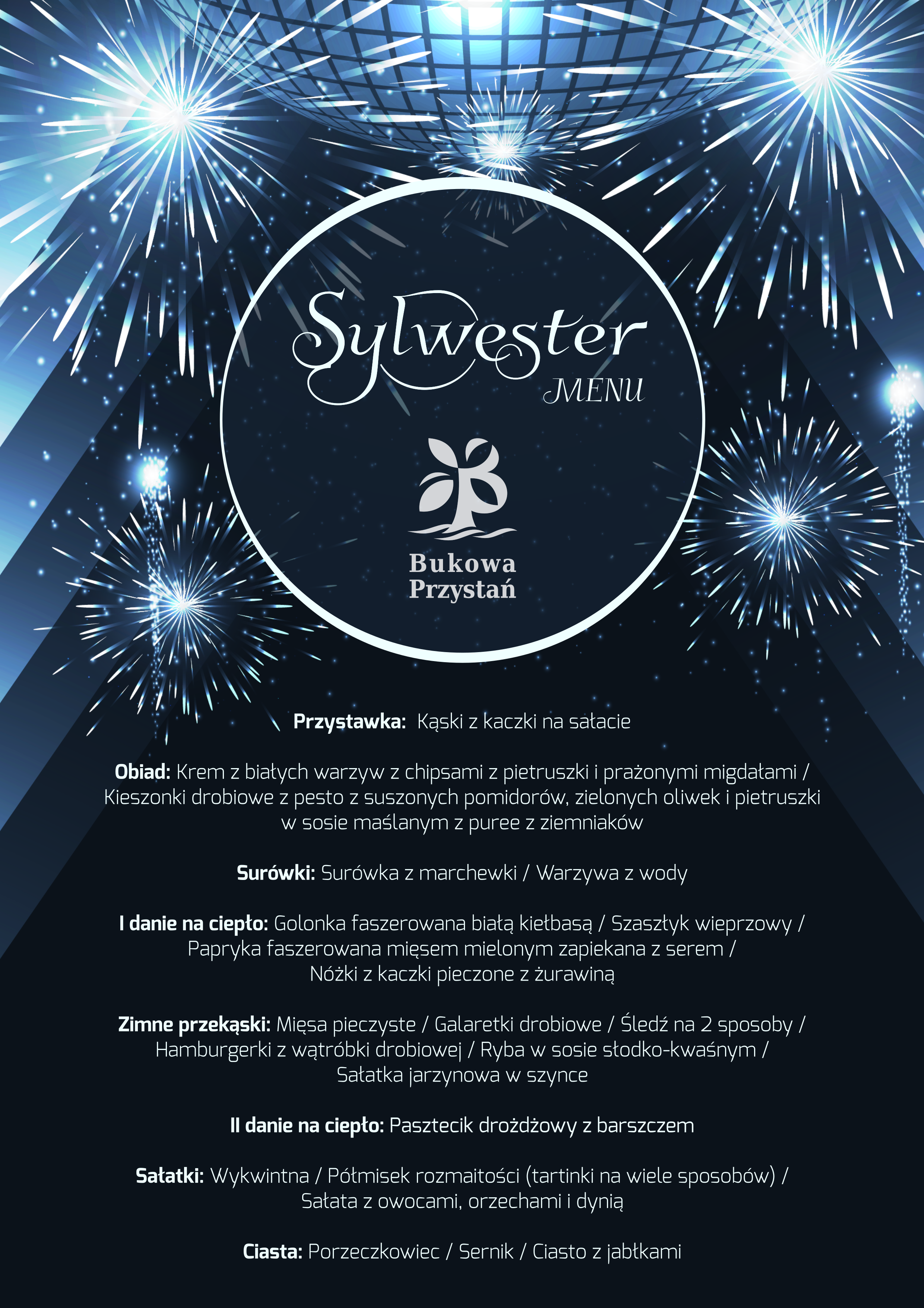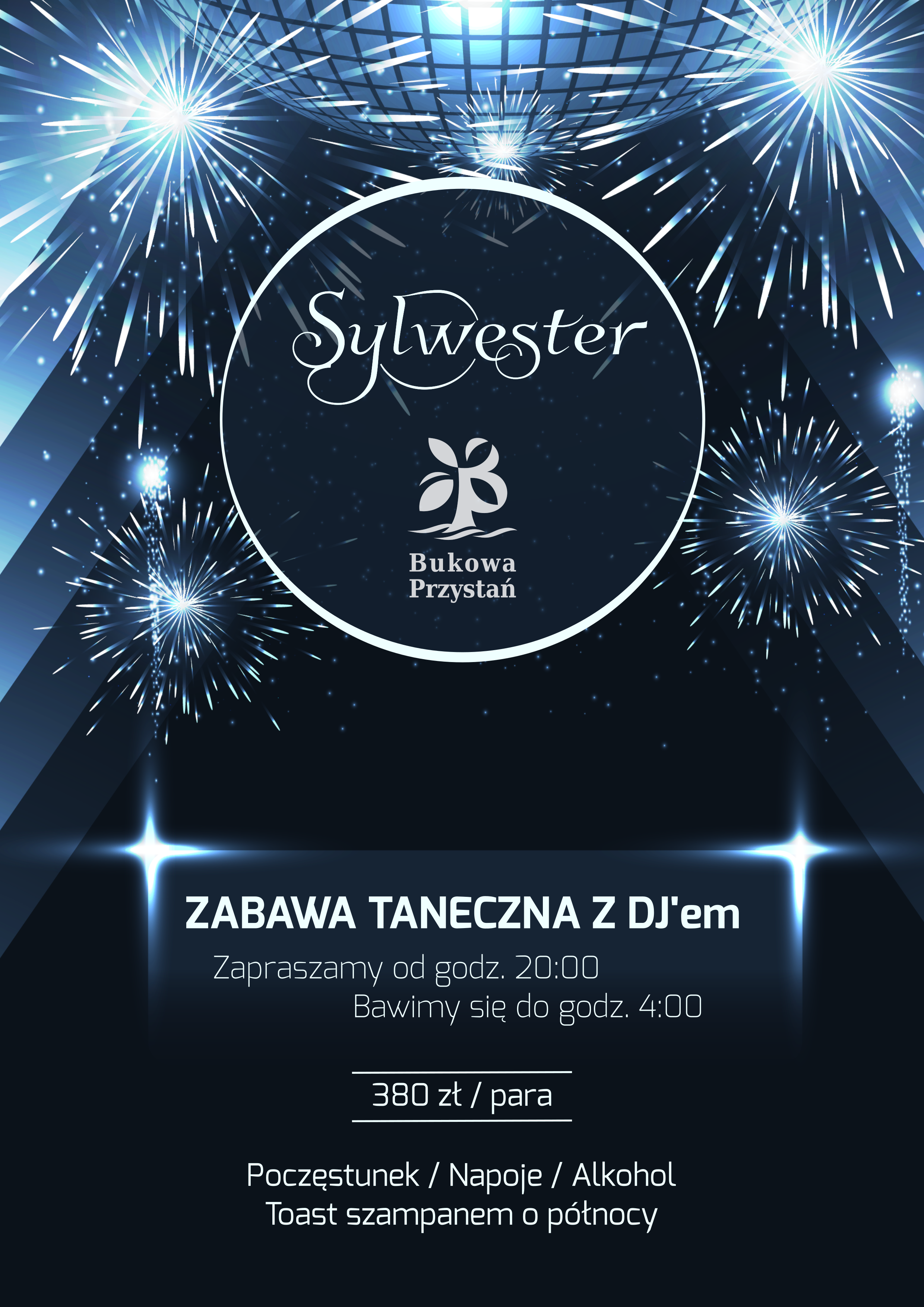 Sylwester 2016/2017 Serdecznie zapraszamy do przywitania Nowego Roku 2017! W przytulnych i stylowych wnętrzach restauracji naszego obiektu przygotujemy dla Państwa szampańską zabawę do rana przy muzyce z DJ-em. Zapewniamy: toast z szampanem o północy, przystawki, dania na ciepło i zimno, surówki, ciasta i przekąski. Zainspiruj się ekskluzywnym stylem i przywitaj Nowy Rok 2017 w Bukowej Przystani!